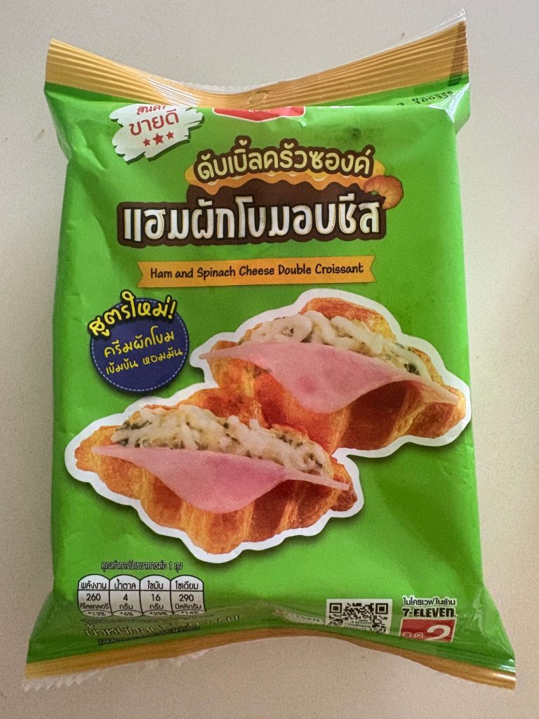 The Ham and Spinach Cheese Double Croissant is one of the most popular 7-Eleven toasties in Thailand. This flaky, buttery croissant comes with two fillings: one with ham and melted cheese for a classic taste, and another with spinach mixed into creamy cheese for a unique, slightly earthy flavor.